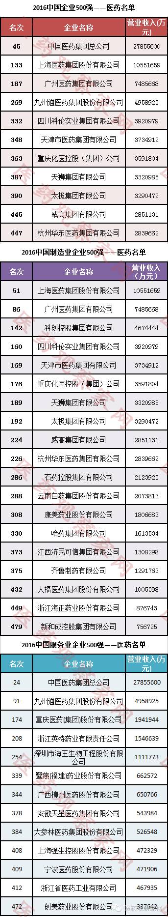 而在2016中国服务业企业500强中,也有13家药企跻身其中,包括九州通医药集团、重庆医药(集团)、浙江英特药业、深圳市海王生物工程等。